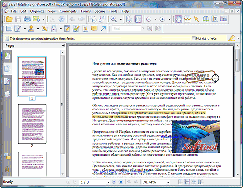 Подтверждение достоверности данных и неизменность документа обеспечиваются простановкой цифровой подписи. Сделано аналогично Adobe - с иллюстрацией подписи в виде специально подготовленного элемента, который может включать в себя различные данные об используемом сертификате, его владельце, причине простановки подписи и так далее. Установка этого элемента на странице еще не говорит о том, что документ подписан, - подпись ставится позже, когда элемент уже установлен.