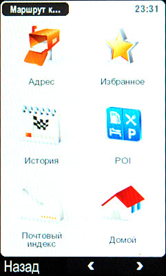 Выводится довольно обширный список выбора пункта назначения. Можно выбрать по адресу или почтовому индексу, можно найти пункт в истории и избранном. Выбрав пункт “POI”, можно отыскать все расположенные неподалёку специальные точки, такие как: автозаправки, аэропорты, больницы, гостиницы, столовые, развлечения, стоянки и.т.д. Помимо предустановленных POI, пользователь имеет возможность вносить в программу свои точки. Пункт “Домой” прокладывает маршрут к предварительно установленным координатам дома. Можно задать координаты не только в текущем городе, но и в любой точке страны, программа проложит путь по междугородним трассам, правда, с удалением на восток от столиц информативность карты сильно снижается. Подробные карты города представлены только для Москвы и Петербурга, в то же время в WM-версии программы заявлено о поддержке 60-и городов, что позволяет надеется на скорый выпуск дополнительных карт и для Android-устройств.