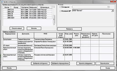 Еще один интересный инструмент – "График отпусков". Он предназначен для составления и редактирования графиков отпусков персонала как отдельных подразделений, так и всей организации. Следует отметить возможность фильтровать записи графика по отдельному сотруднику или должности. После составления (редактирования) графика с помощью специальной кнопки производится проверка на наложение отпусков друг на друга для сотрудников одного подразделения. Проверка завершается информационным окном с сообщением о присутствии или отсутствии этих несоответствий. И, конечно, предусмотрена возможность печати итогового документа.  | | График отпусков |