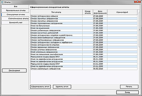 Разнообразные отчеты по сотрудникам можно сформировать в "Отчетах". Пользователь может формировать как стандартные (список сотрудников, список сотрудников по отделам, список вакантных мест, список детей сотрудников, список военнообязанных, список уволенных, список женщин, список мужчин), так и произвольные (пользователь сам выбирает поля базы данных, которые необходимы ему для отображения в отчете) отчеты с возможностью экспорта в форматы Word и Excel. Также есть возможность формировать статистические отчеты и отчеты по воинскому учету.  | | Отчеты |