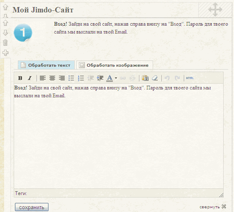 Для подключения к сервису и получения своего доменного имени (домен третьего уровня на jimdo.com) достаточно зарегистрироваться и уже через несколько минут иметь возможность работать над сайтом. В дальнейшем вход на сайт будет уже с вашей страницы.