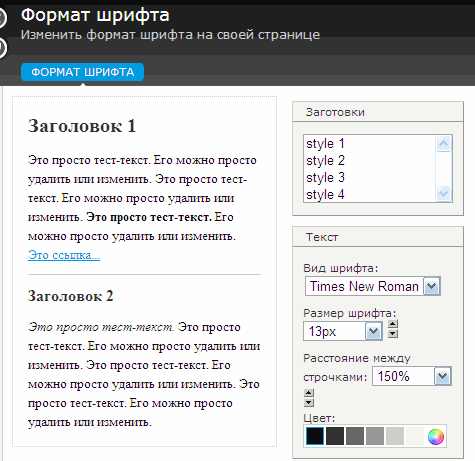 Перед тем как приступить к работе над страницами, можно выполнить ряд дополнительных настроек стиля. С их помощью настраиваются характеристики основного текста, двух типов заголовков, разделители и ссылки. Ну а если нет желания что-то выдумывать, можно выбрать один из четырех уже готовых стилей.