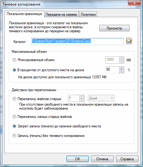 Более жесткий контроль за использованием съемных и иных устройств осуществляется с помощью опции теневого копирования. Оно предназначено для контроля информации, которая записывается на внешние носители. При включенной опции теневого копирования файл перед записью на сменный носитель сначала копируется в локальное хранилище на локальном жестком диске и лишь потом - на указанный носитель. При теневом копировании файлов, записываемых на диск, параллельно с записью создается образ диска, а после завершения записи файлы из образа копируются в локальное хранилище. Из локального хранилища файлы по установленному расписанию переносятся на сервер, где фиксируются для возможного анализа.
