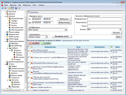 Работу с письмами может выполнять в своем личном кабинете программы Traffic Inspector каждый пользователь, что помимо определения спама позволяет индивидуально настраивать папки для сортировки входящих писем и спама. Сформированные списки пришедшей почты можно сортировать по различным признакам, накладывать фильтры на просмотр (например, оставляя только сомнительные). Отчеты можно формировать и по такому параметру, как слова, по которым письма были отнесены к категории "спам".