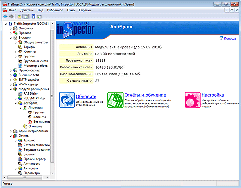 Модуль, встраиваемый в Traffic Inspector, - самообучаемый. Он анализирует все входящие сообщения, распознавая спам по правилам и алгоритмам, которые выводятся собственной самообучающейся системой. Но все же помощь администратора или пользователя необходима - нельзя полностью полагаться на работу программы, так как фильтры могут давать сбои, пропуская явный спам и записывая в недоброкачественную почту вполне корректные сообщения.