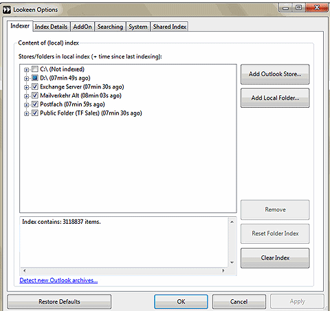 Как и любая иная программа, эта также имеет свои настройки. Вызываются через меню Options. Первая закладка позволяет просмотреть, какие разделы почтового клиента, архивы и папки вошли в состав индекса. В перечне, помимо самих разделов, указывается время, прошедшее с предыдущего процесса индексирования. Здесь можно отключить индексацию определенных разделов, либо добавить новые. Причем в индекс можно добавлять не только файлы Outlook (как рабочие, так и архивные), но и отдельные разделы вашего диска - в этом случае файлы, находящиеся в них, также будут проиндексированы. Здесь же можно удалить сформированный индексный файл и выполнить индексирование заново.