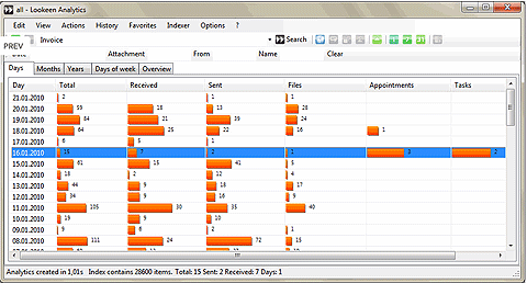 Иногда требуется не только найти какие-то определенные письма, но еще и определить, сколько их было получено и отправлено по датам. Такая возможность предоставляется программой с помощью опции Analytics. В результате вы получите таблицу в разрезе дней с данными о количестве отправленных и полученных писем, а также количестве файлов, включенных в эти письма. Если щелкнуть по какой-либо дате, вам будет представлен перечень писем за эту дату.