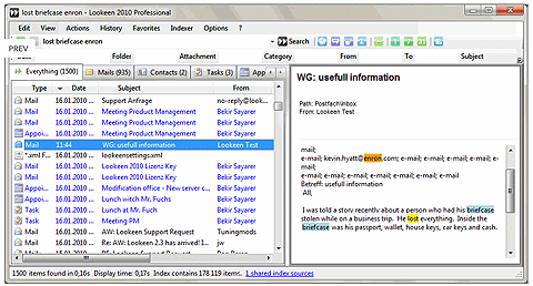 И еще одна очень интересная возможность. Пока что мы говорили о результатах поиска, как они представлены в итоговой таблице в окне программы. Но в этом окне для результатов выделяется только одна половина. Вторая предназначена для вывода текста письма или содержимого файла. Для отображения этой информации достаточно навести курсор на строку таблицы, и во втором окне будет показано содержание. В нем будут выделены цветом слова вашего поискового запроса. Надо отметить, что даже нелокализованная версия программы весьма успешно индексирует и проводит поиск на русском языке.