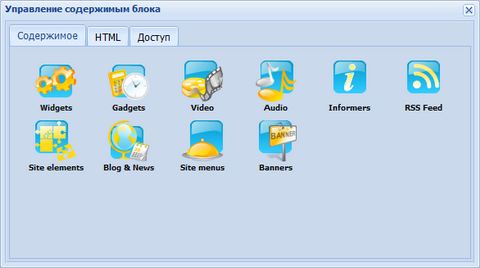 Содержимое блоков может быть практически любым: элементы сайта (мини-чат, форма входа, облако тегов и т. п., в зависимости от подключенных модулей), баннеры, информеры, RSS-ленты, мультимедиа, многочисленные виджеты/гаджеты... Если здесь чего-то не хватает, можно просто вставить HTML-код нужного объекта – например, такого, как контекстный рекламный блок. Также есть возможность отметить, каким группам пользователей и в каких разделах сайта выбранное содержимое будет демонстрироваться.