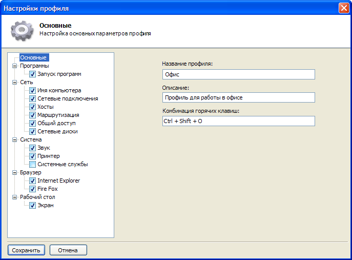 Для начала работы необходимо создать профили конфигурации. В свойствах профиля необходимо задать имя профиля, включить необходимые разделы конфигурации и задать их настройки. Можно назначить сочетание горячих клавиш, при нажатии которых профиль будет активироваться. Так же, для ускорения доступа к профилю, можно создать ярлык для профиля на рабочем столе.