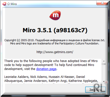 Miro - медиаплеер, основное предназначение которого - облегчение просмотра видео в Интернете. Плеер позволяет подключаться к видео-каналам, загружать видео-файлы на компьютер, просматривать ролики в полноэкранном режиме и т.д. Miro прост в работе и абсолютно бесплатен. Смотрите практически любое видео - Quicktime, WMV, MPEG, AVI, XVID и другие форматы. Просматривайте свою коллекцию, делайте плейлисты, сохраняйте порядок. Подписывайтесь на любые потоки RSS, содержащие видео, подкасты или видеоблоги. Исследуйте сотни свободных каналов при помощи встроенной программы передач.