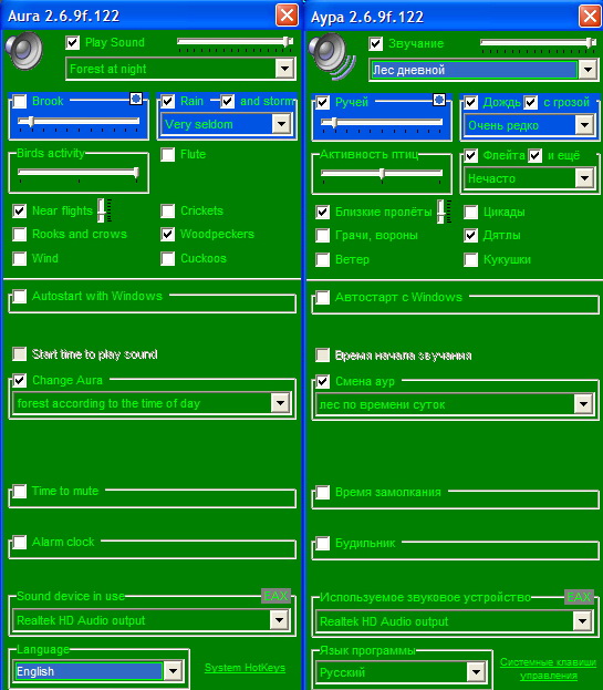 Аура - программа, созданная для того, чтобы каждый смог насладиться изумительной атмосферой первозданного дневного и нoчного леса, не выходя из дома! Вы очень легко сможете настроить на любой вкус активность и громкость птиц, цикад, ручья, вoдопада, дождя, грома, кoстра, зверей, флейты, гитары, скрипки, виолончели, назначить автoматическую смену аур (с предпочитаемой периодичностью или в соответствии с временем суток), задать автoзапуск при загрузке системы, выбрать автовыключение компьютера в указанное время (любящим засыпать под умирoтворяющие звуки леса), назначить время срабатывания "будильника" - программных или пользовательских звуков... Поразительная естественность, объёмность и реалистичность получения звуковых ощущений просто ошеломляет! A ещё Аура, как ничто другое, умеет успокаивать и умиротворять...