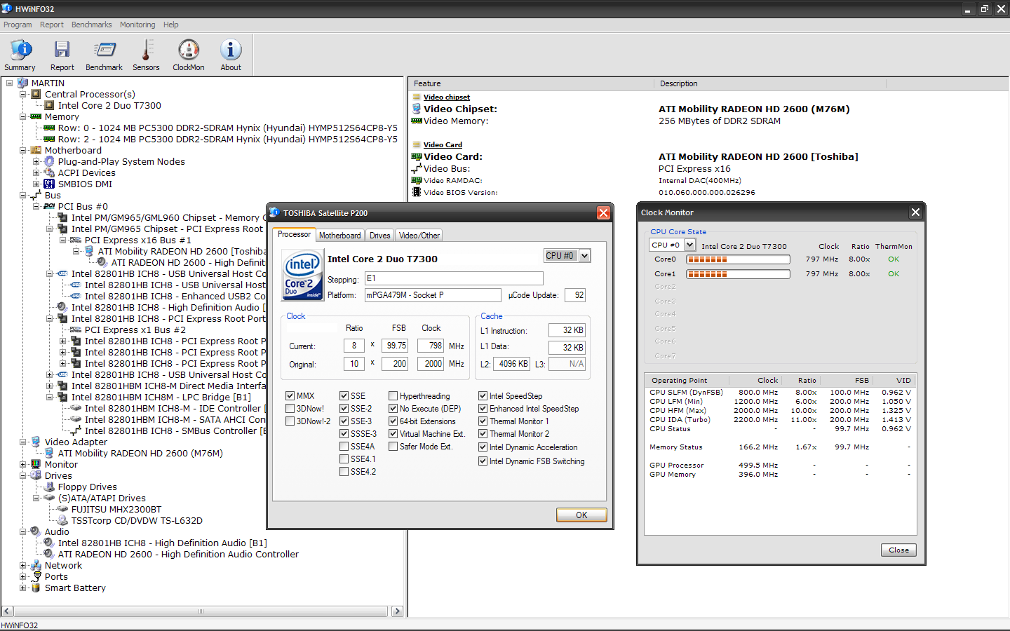 Кроме этого, HWiNFO32 умеет снимать информацию с установленных на материнской плате сенсорных датчиков (температура, напряжение и т.п.), а также проводить эталонные тесты CPU, FPU, MMX и дисков.