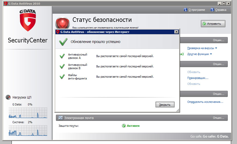 GData - Вирусная защита, использующая DoubleScan и технологию OutbreakShield. Заслуживающее награды антивирусное программное обеспечение теперь вооружилось третьим экраном безопасности: В несколько секунд новая технология OutbreakShield блокирует новые вирусы, а это намного быстрее чем любое другое антивирусное программное обеспечение!При загрузке обещает ежечасные обновления.