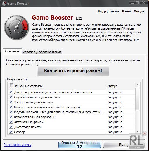 Game Booster – утилита, предназначенная для настройки компьютера на максимальное быстродействие в играх, путем оптимизации многих параметров операционных систем Windows. Сочетание нескольких вариантов оптимизации (дефрагментация оперативной памяти и жесткого диска, диагностика конфигурации DirectX и др.) помогает полностью раскрыть потенциал вашего компьютера. В арсенале любого опытного геймера можно обнаружить огромное количество утилит, которые позволяют повысить производительность игрового ПК. Многие из этих приложений не предполагают «разгона» аппаратных компонентов и обеспечивают прирост производительности за счет освобождения системных ресурсов и оптимизации работы ОС. Game Booster может дополнить собой указанную коллекцию полезных программ.