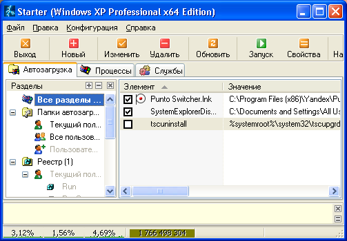 Менеджер автозагрузки, диспетчер задач и редактор служб в одном флаконе. Не требует установки, прост и удобен настолько, насколько это вообще возможно. Вот вам все места, где могут прописаться в автозагрузку программы, вот вам списки служб и запущенных процессов — делайте с ними все, что захотите. А если не знаете, что это за ерунда загружается при старте системы и нужна ли она, найдите свой ответ в интернете — Starter отведет вас за ручку на нужный сайт.