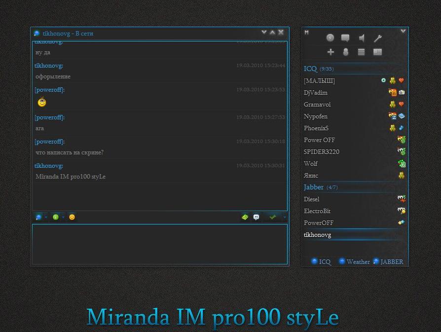 Miranda IM pro100styLe - новая сборка, которая включает в себя такие дополнительные возможности, как проверка орфографии, напоминание о днях рождения, антиспам, прогноз погоды, быстрое скрытие миранды по F12 и многое другое. Так же вы можете самостоятельно совершенствовать её, предлагать свои варианты дальнейшего развития, и даже стать соавтором, приняв участие в проекте.