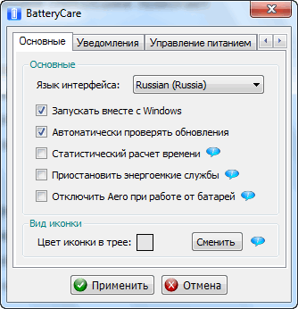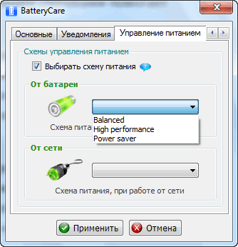 Кроме этого, BatteryCare может автоматически отключать интерфейс Aero и останавливать энергоемкие службы, как только ноутбук начинает работать от аккумулятора. При помощи BatteryCare можно быстро изменять параметры управления электропитанием. Для выбора нужного профиля достаточно щелкнуть по значку программы в системной панели и выбрать подменю "Схемы управления электропитанием". А в настройках программы можно отдельно задать профили, которые будут использоваться при работе ноутбука от аккумулятора и от сети.