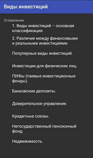 Виды инвестиций - приложение для андроид, созданное с целью повышения финансовой грамотности. Содержит в себе материалы на тему инвестиций.