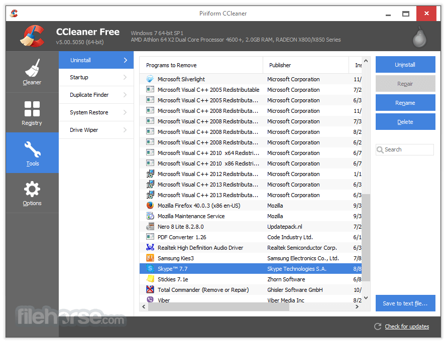 CCleaner умеет глубоко сканировать систему, находя и удаляя старые, ненужные, неиспользуемые и остаточные файлы после работы браузеров и приложений, а также и обновлений системы. Поддерживается работа со всеми популярными браузерами (Internet Explorer, Firefox, Google Chrome, Opera, Safari), где CCleaner почистит временные файлы, историю посещений и загрузок, куки-файлы, автозаполнение регистрационных форм и др. Кроме того, эта утилита отлично справлется с удалением мусора, остающегося после разного рода приложений мультимедиа (AIMP, Adobe Flash Player, VLC и др.), продуктов Microsoft (Office, OneDrive и т.д.), почтовых программ, чатов и загрузчиков (the Bat, Skype, uTorrent), архиваторов (WinRAR, 7-zip) и многих других.