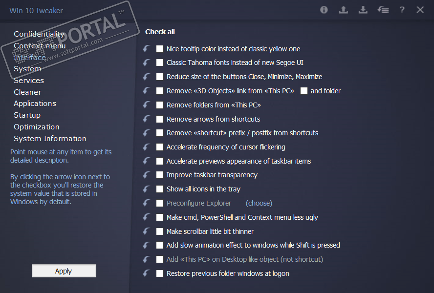 Win 10 Tweaker — это компактная, но эффективная утилита для оптимизации, очистки и персонализации Windows. Программа позволяет быстро отключить ненужные службы, удалить встроенные приложения, настроить интерфейс и повысить производительность системы всего в несколько кликов.
