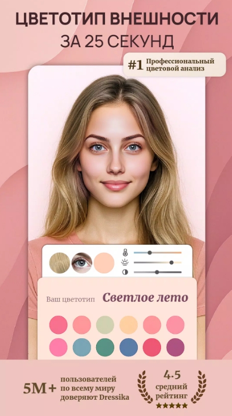 Dressika — это ваш персональный консультант по стилю, который поможет раскрыть вашу природную красоту. С помощью искусственного интеллекта приложение определит цветотип внешности, подберет идеальные цвета для одежды и макияжа, а также создаст гармоничные образы.