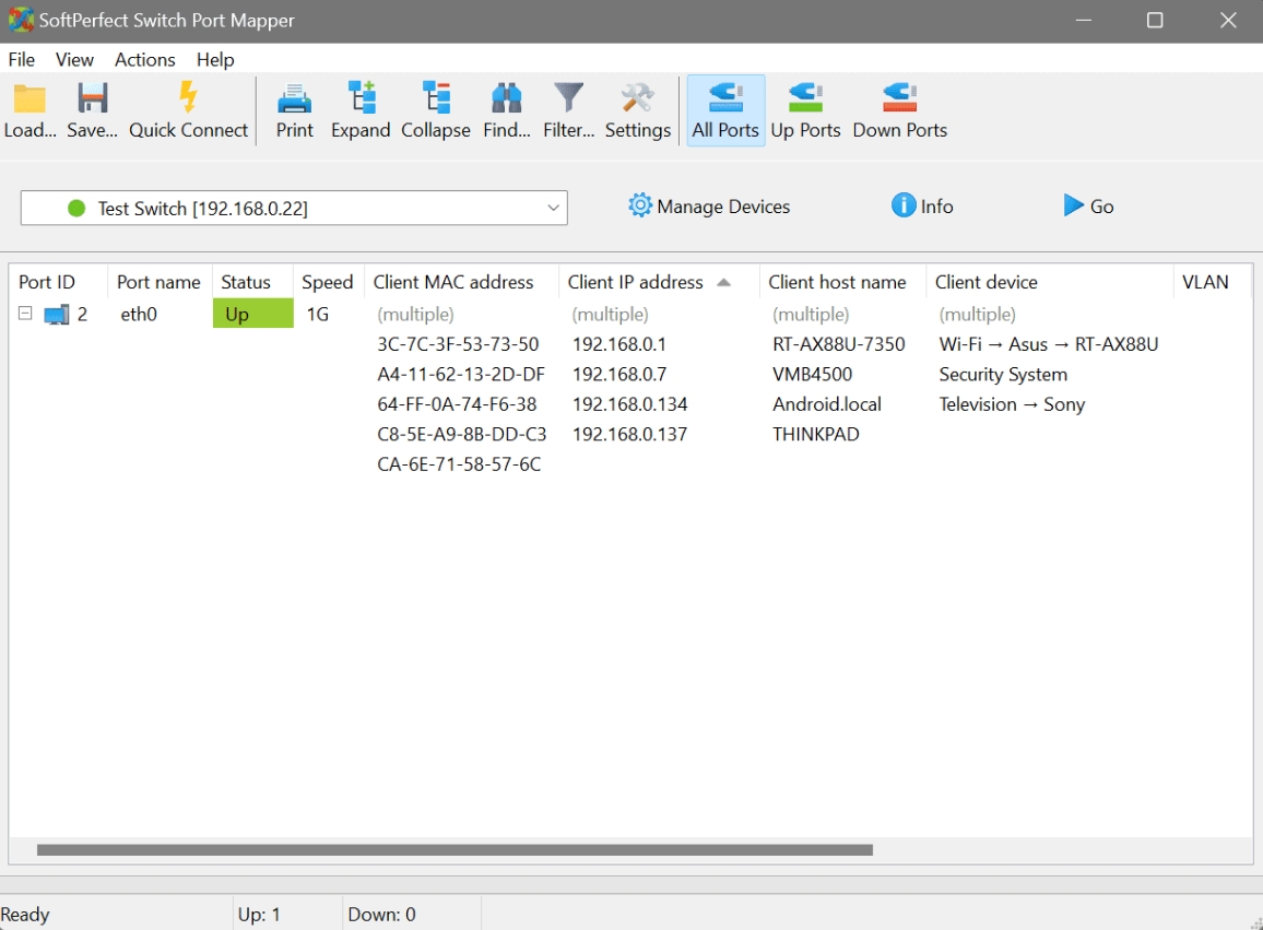 Switch Port Mapper представляет собой профессиональное программное решение, предназначенное для мониторинга и анализа сетевой инфраструктуры. Утилита использует протокол SNMP (с поддержкой v1, v2c, v3) для взаимодействия с сетевым оборудованием и предоставляет структурированное отображение состояния портов коммутаторов и маршрутизаторов.
