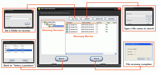 Win Data Recovery - программа для восстановления данных, которые были утрачены, при форматировании диска, удаления в корзину или по различным другим причинам. Программа имеет интуитивно понятный интерфейс, поддерживает файловые системы FAT16, FAT32, VFAT, NTFS и NTFS5, работает с жёсткими дисками и сменными носителями, восстанавливает файлы форматов txt, doc, xls, pdf, bmp, exe, html, jpg, avi, mp3 и другие популярные форматы.