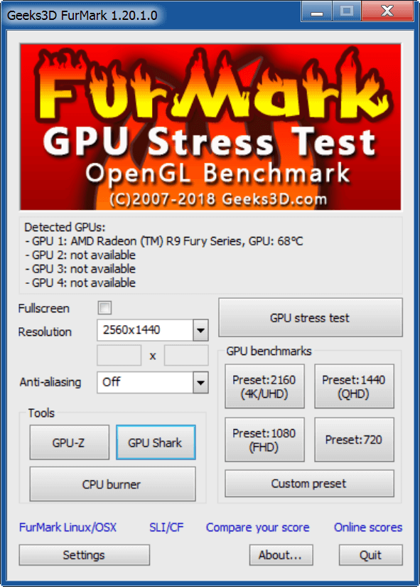 FurMark - одна из лучших утилит для тестирования стабильности разогнанных видеокарт и проверки возможностей их систем охлаждения, к тому же неплохой бенчмарк.