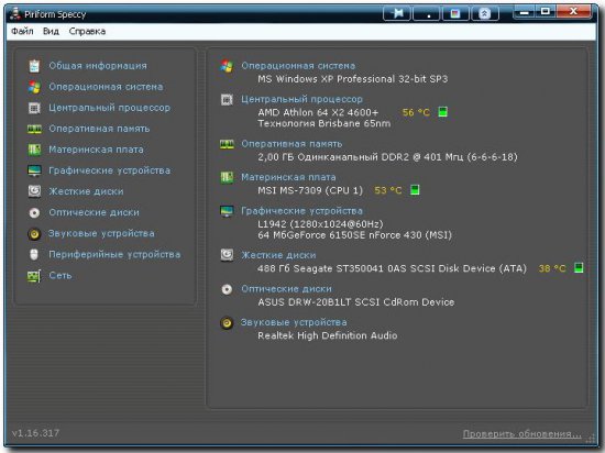 Speccy - небольшая утилита от разработчиков популярнейшего приложения для очистки компьютера от системного мусора CCleaner. При запуске Speccy мониторит аппаратную часть компьютера, и отображает информацию об операционной системе и характеристики установленного железа. С помощью программы пользователь сможет узнать версию операционной системы, подробную информацию о процессоре, операционной памяти, винчестере, материнской плате, видео карте и др. Кроме того отображаются температурные показатели ...