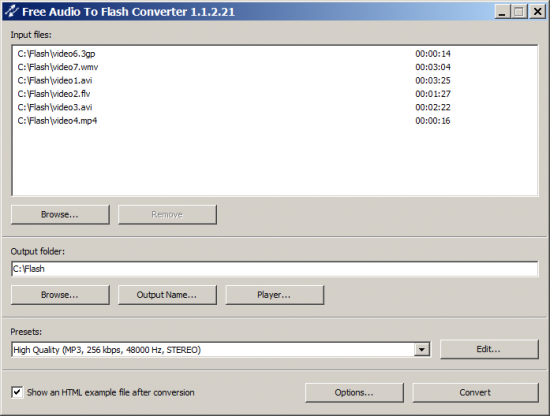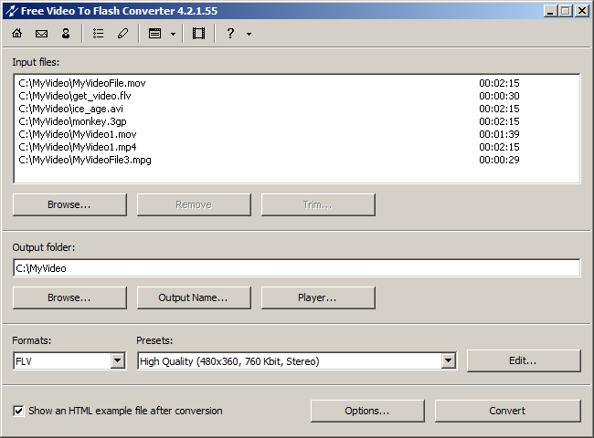 Free Video to Flash Converter - программа поможет Вам конвертировать видео во flash (SWF и FLV) для Вашего веб-сайта или блога с помощью бесплатного конвертера видео во flash. Вы можете сконвертировать фильм целиком или только его часть. Доступны 60+ скинов для плеера.