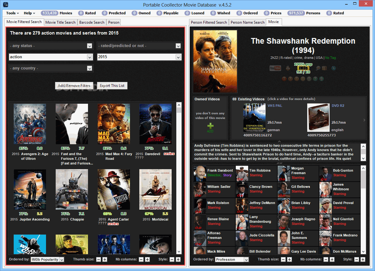 Вы получаете данные о 33,000 фильмах и 68,000 звездах большого экрана и буквально каждого в этом списке вы можете оценить, составив свой топ. Вы можете вести список фильмов, которые у вас уже есть (конечно же, со всеми техническими подробностями о диске), которые вы только хотели бы купить и тех, что вы забываете забрать у друзей...