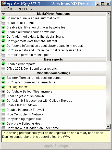 Поробнее ... XP-AntiSpy утилита для отключения подозрительных или лишних функций Windows XP/Vista, таких как автообновления системы, отправка отчета об ошибках, автозапуск MSN Messenger или идентификации плеера, а также многое другое. Программа представляет собой удобную оболочку для доступа к ключам реестра, отвечающим за отключение этих и многих других подозрительных...