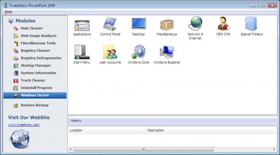 TweakNow PowerPack 2009 - пакет предназначенный для оптимизации работы операционной системы. Включает в себя твикер (т.е. настройщик скрытых или труднодоступных параметров системного реестра), а также программы RAM Idle Professional, RegCleaner Pro, AutoShutdown, CD Autorun, System Info и Virtual Desktop, обьединенные единым интерфейсом.