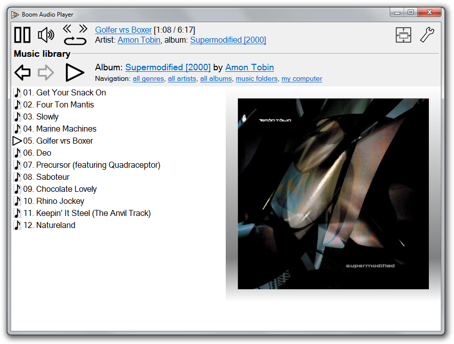 Boom – самый простой и легкий в использовании аудио-плеер предназначенный для обычных пользователей компьютеров, которые не хотят тратить свое время на выяснение более сложных настроек других плееров. Все наиболее важные функции легко использовать практически моментально.