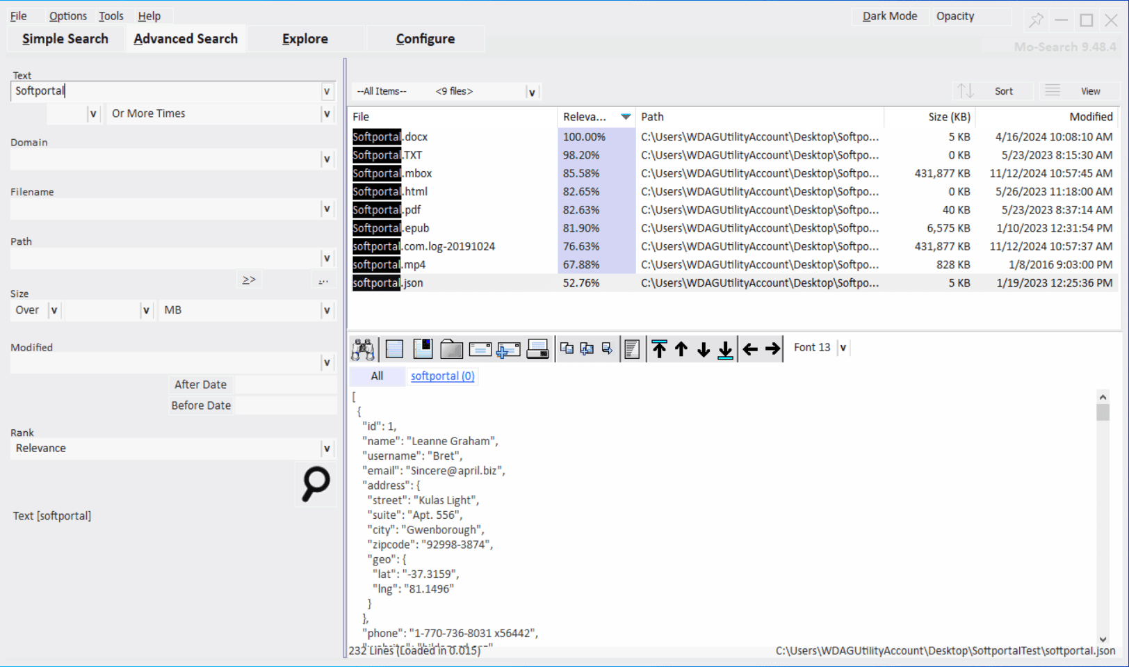 Mo-Search — это профессиональная программа для быстрого и точного поиска файлов на компьютере. С помощью интеллектуальной индексации и гибких фильтров она позволяет находить нужные данные даже в сложных структурах папок. Дополнительные инструменты для анализа дубликатов, проверки контрольных сумм и работы с WHOIS делают Mo-Search универсальным решением для организации файлов и оптимизации дискового пространства.