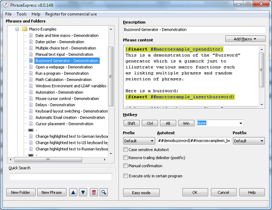 PhraseExpress - это приложение, которое помогает пользователям устранять повторяющиеся операции ввода текста, автоматически заполняя предустановленные фразы в документе, а также организуя их в различные категории.